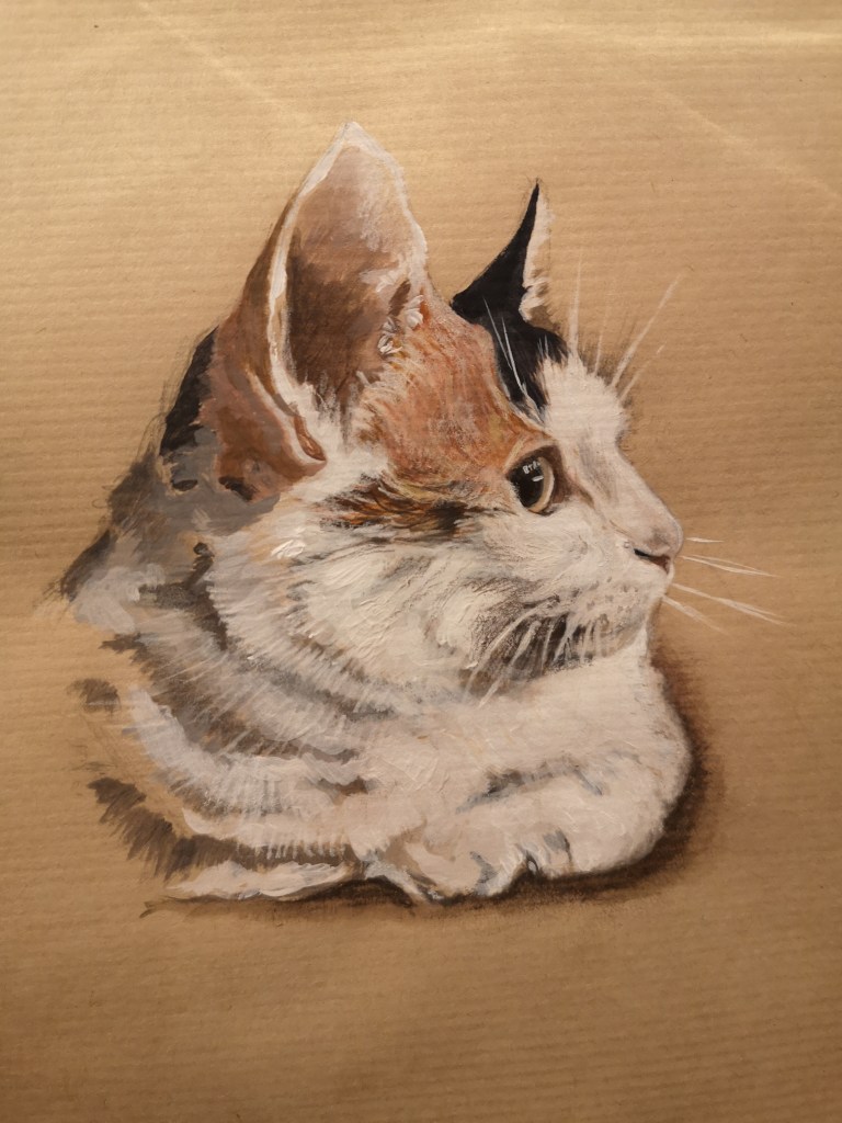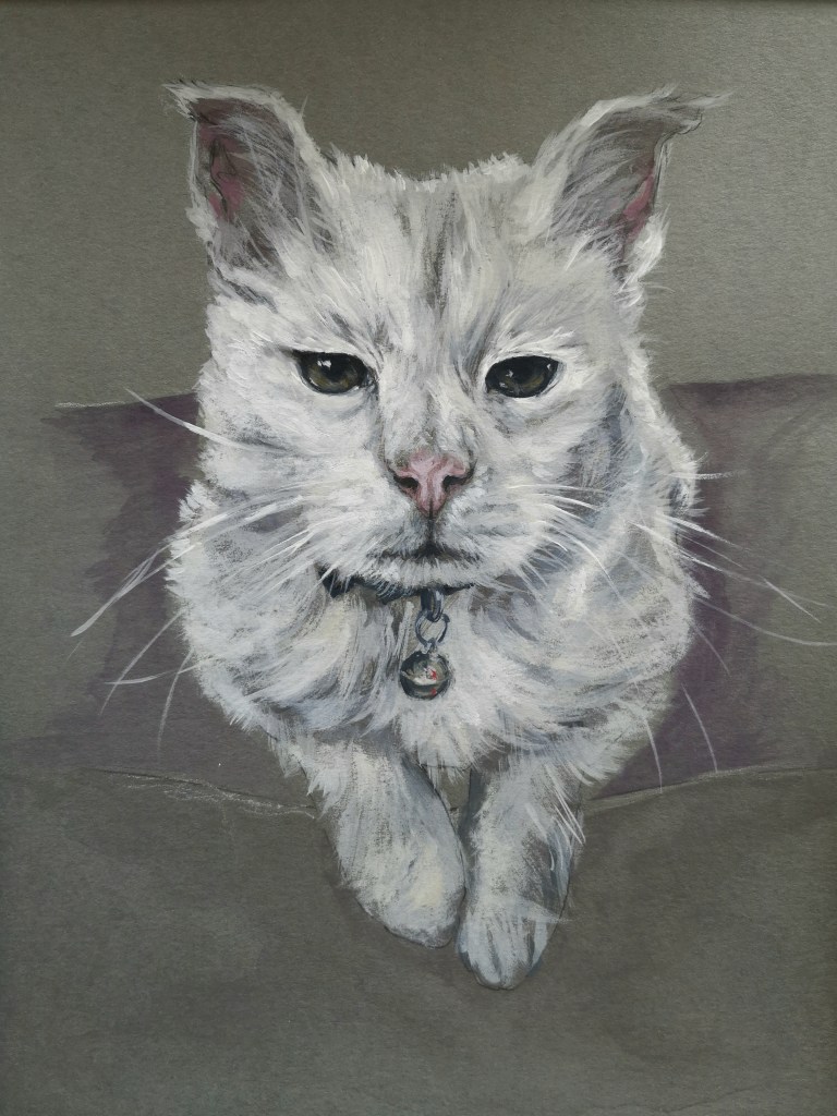 Gibson Cat, Mixed media acrylic & conte on paper. 10″ x 10″Lucy, Acrylic on board 12″ x 16″Buster, Acrylic on Canvas 16″ x 20″Ted, Oil on Canvas 16″ x 20″