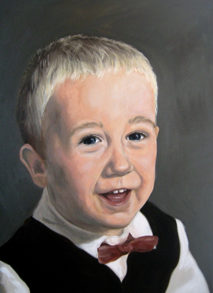 Once you have contacted Jenny about commissioning your portrait, you can either email or post your photographs, or whenever possible, meet up in person, and discuss how you would like your portrait to look. It’s always good to have a little background on the portrait’s subject, and whether there are specific details you’d like included in the painting.